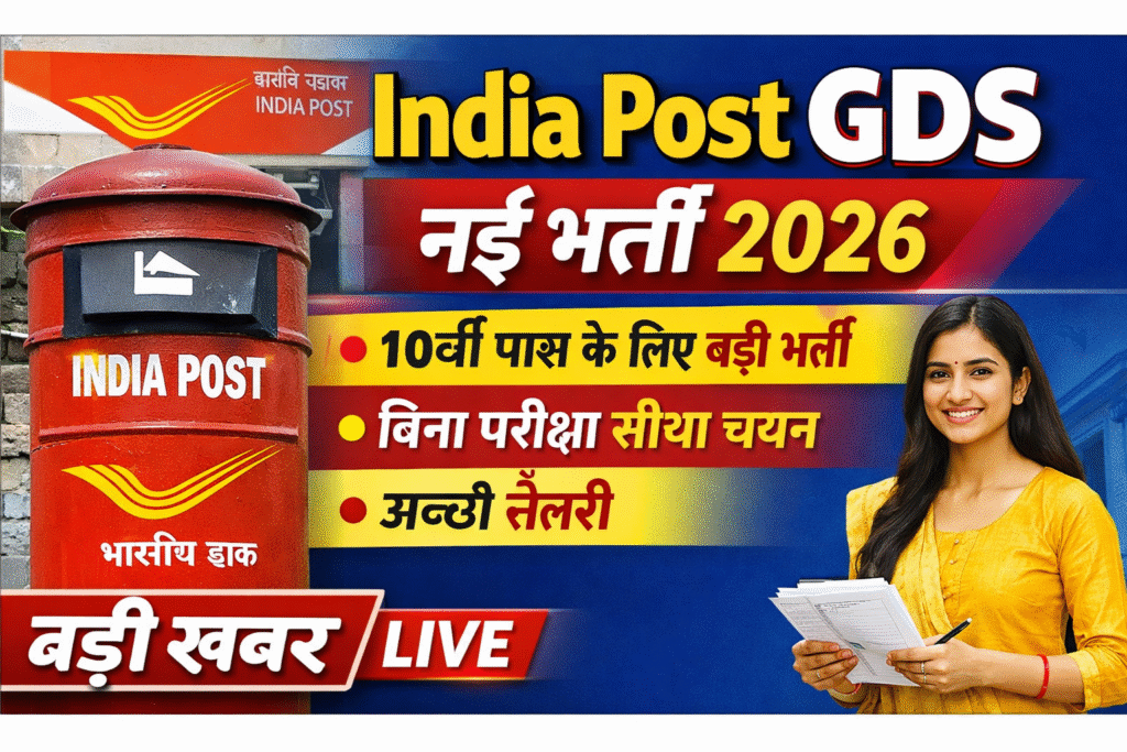 рдЕрдЧрд░ рдЖрдк 10рд╡реАрдВ рдкрд╛рд╕ рд╣реИрдВ рдФрд░ рд╕рд░рдХрд╛рд░реА рдиреМрдХрд░реА рдХреА рддрд▓рд╛рд╢ рдХрд░ рд░рд╣реЗ рд╣реИрдВ, рддреЛ рдЖрдкрдХреЗ рд▓рд┐рдП India Post Office GDS рднрд░реНрддреА 2026 рдПрдХ рдмрд╣реБрдд рдмрдбрд╝рд╛ рдореМрдХрд╛ рд╣реЛ рд╕рдХрддрд╛ рд╣реИред рд╣рд░ рд╕рд╛рд▓ рднрд╛рд░рддреАрдп рдбрд╛рдХ рд╡рд┐рднрд╛рдЧ (India Post) рджреНрд╡рд╛рд░рд╛ Gramin Dak Sevak (GDS) рдкрджреЛрдВ рдкрд░ рд╣рдЬрд╛рд░реЛрдВ рднрд░реНрддрд┐рдпрд╛рдБ рдирд┐рдХрд╛рд▓реА рдЬрд╛рддреА рд╣реИрдВред